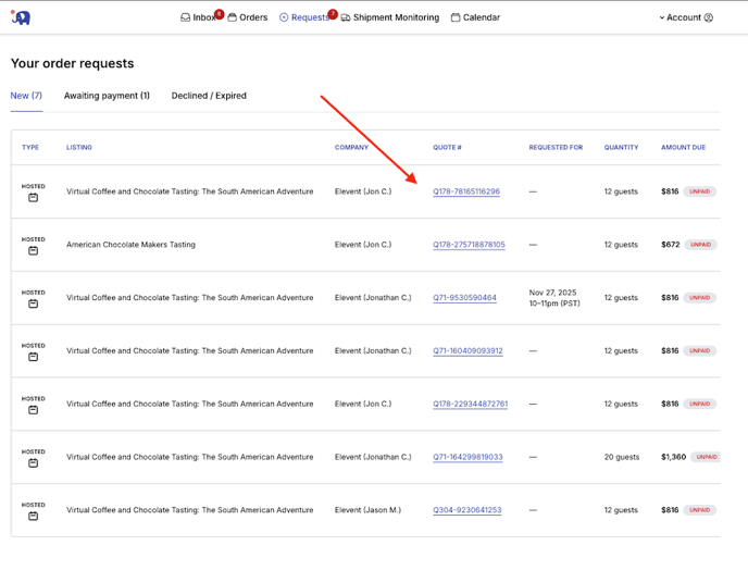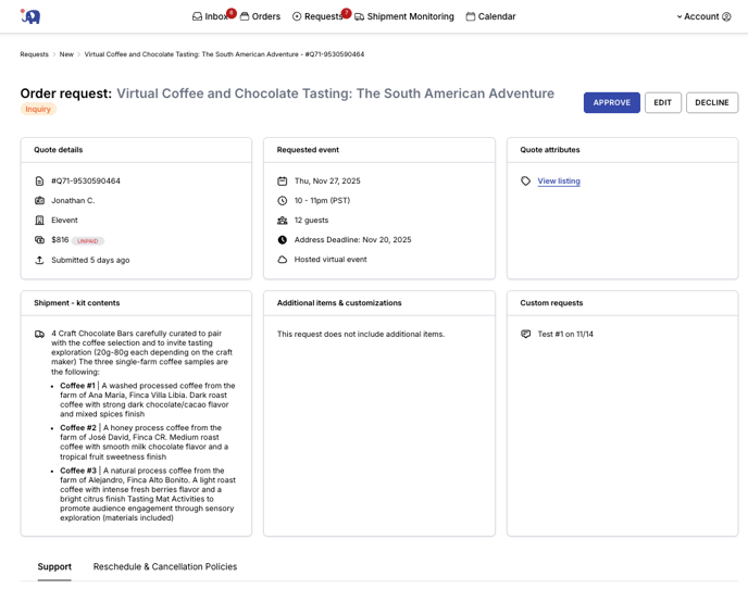 2. Login to your Host Portal to enter the approve/review the event information. Click on the quote to see the details and approve. If you need to edit or change the date press edit.